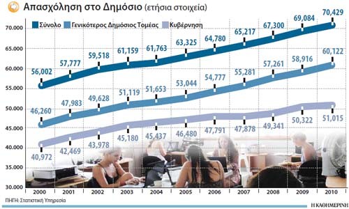 Την ίδια εικόνα σχηματίζουν και τα ετήσια στοιχεία που δημοσιεύει η Στατιστική Υπηρεσία, σύμφωνα με τα οποία η αύξηση της απασχόλησης στο Δημόσιο συνεχίζει την ανοδική πορεία που είχε από τις αρχές του 2008, παρά τις δηλώσεις περί του αντιθέτου.