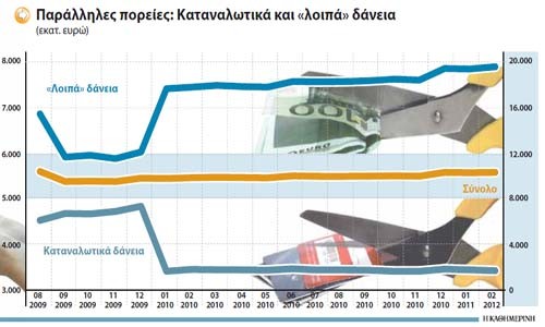 Σαφής είναι η στροφή από τα «κλασικά» καταναλωτικά δάνεια προς την κατηγορία «άλλα δάνεια». Οι τράπεζες εξυπηρετούν την απληστία των νοικοκυριών