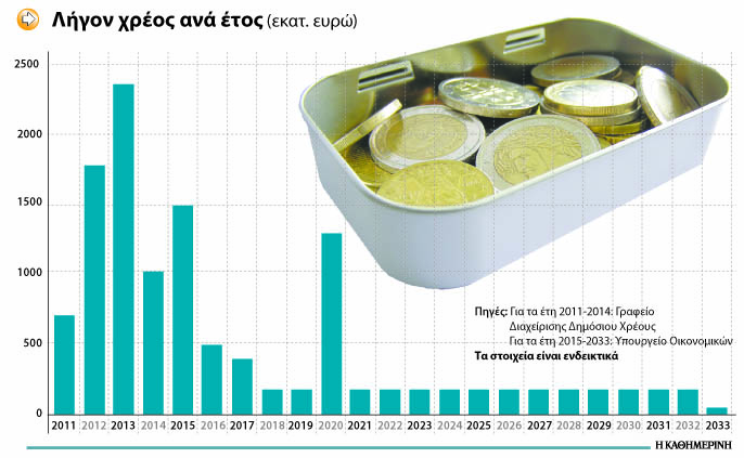 Το 2013, όμως, παρατηρείται η μεγαλύτερη λήξη χρέους. Οι ανάγκες αναχρηματοδότησης χρέους, βάση των σημερινών δεδομένων, θα προσεγγίσει τα 2,5 δισ. ωστόσο, αυτός ο αριθμός θα πρέπει να θεωρείται ως το κατώτατο αναμενόμενο ποσό, αφού δεν συμπεριλαμβάνει, ούτε τις ανάγκες δανεισμού για κάλυψη των αναγκών του προϋπολογισμού που θα προκύψει, αλλά ούτε και το όποιο βραχυπρόθεσμο χρέος (διετές, 52 εβδομάδων ή 26