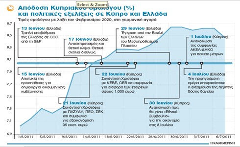 Μάλιστα, στις 17 Ιουνίου, μετά το θετικό κλίμα που δημιουργήθηκε με τον κυβερνητικό ανασχηματισμό στην Ελλάδα, η ανοδική πορεία των επιτοκίων συνεχίστηκε, χωρίς να υπάρξει καμία «αντίδραση» από τους επενδυτές. Παρομοίως αντίθετη ήταν η πορεία των επιτοκίων μερικές αργότερα, όταν ολοκληρώθηκε η πολυαναμενόμενη έγκριση του Μεσοπρόθεσμου Πλαισίου από τη Βουλή των Ελλήνων. Τότε, παρά τα θετικά μηνύματα που είχε στείλει η Ελλάδα, παρατηρήθηκε επιτάχυνση της αύξησης των επιτοκίων του κυπριακού ομολόγου.