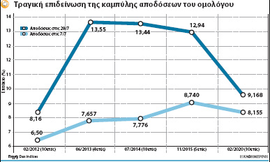 Εν τω μεταξύ, στη διεθνή αγορά η καμπύλη των αποδόσεων έχει επιδεινωθεί σημαντικά. Όπως έγραψε η «Καθημερινή» προ δύο εβδομάδων, η καμπύλη παρουσίαζε στις αρχές του μήνα ένα παράδοξο χαρακτηριστικό: Το μακροπρόθεσμο χρέος, που λήγει το Φεβρουάριο του 2020, κατέγραφε χαμηλότερα επιτόκια από το μεσοπρόθεσμο, που λήγει τον Νοέμβριο του 2015.