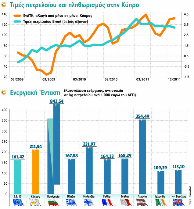 Είναι, έτσι, φυσιολογικό η οικονομία να αντιμετωπίζει ισχυρές πιέσεις από τον πληθωρισμό, ο οποίος, μέσα από τη μείωση της ανταγωνιστικότητας, μειώνει και τις προοπτικές ανάπτυξης μέσα στο 2012.