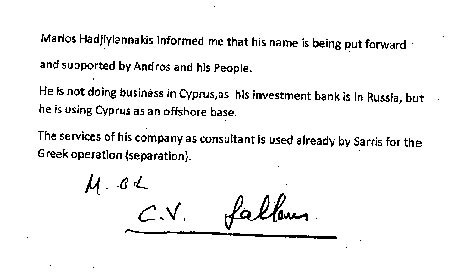 Δηλώνω κατηγορηματικά ότι για το διορισμό του κου Μάριου Χατζηγιαννάκη δεν ενημέρωσα εκ των προτέρων κανένα Αρχηγό κόμματος και ούτε εισηγήσεις δέχθηκα από κανένα αρχηγό κοινοβουλευτικού κόμματος ή κομματικούς παράγοντες. Ειδικότερα, επειδή στο σημείωμα που μου στάληκε με το βιογραφικό του κου Χατζηγιαννάκη και δόθηκε ακολούθως στην Επιτροπή Οικονομικών της Βουλής γίνεται αναφορά στο όνομα «΄Αντρος» κάτι που μπορεί να οδηγήσει σε τυχόν συσχετισμούς που αφορούν το Γενικό Γραμματέα του ΑΚΕΛ, δηλώνω απερίφραστα ότι εγώ ουδέποτε μίλησα με τον κο. Κυπριανού για το θέμα του διορισμού των μελών στο Δ.Σ. της Λαϊκής Τράπεζας». Επίσης, δηλώνω ότι, ουδέποτε έλαβα υπόψη μου την αναφορά στο όνομα «Άντρος».