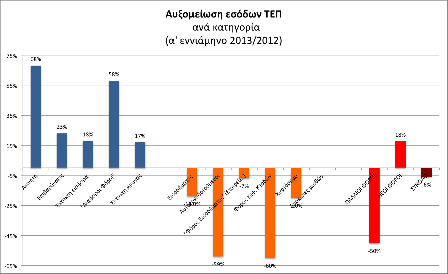 Στον αντίποδα, όμως, άμεσοι φόροι που συλλέγει το ΤΕΠ σε κατηγορίες φόρων όπου έγινε αύξηση ή επιβλήθηκαν νέες φορολογίες, καταγράφουν σημαντική αύξηση της τάξης του 18%, γεγονός που μειώνει την τελική τρύπα στα έσοδα του ΤΕΠ.