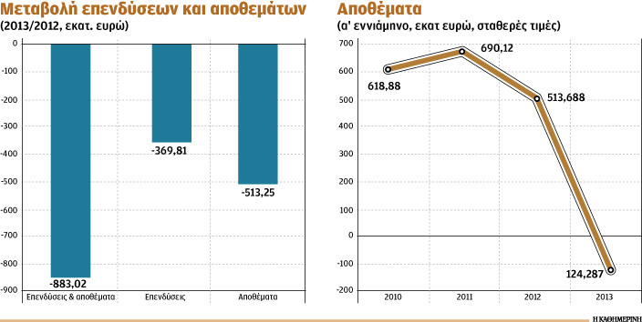Το μεγάλο ζήτημα, ωστόσο, για το 2014 και το 2015, φαίνεται πως θα έχει να κάνει με τις επενδύσεις. Η μείωση του εμπορικού ελλείμματος αντικατοπτρίζει, εδώ και καιρό τη μείωση των ξένων επενδύσεων στην Κύπρο. Ταυτόχρονα, όμως, η μείωση των εισαγωγών μεταφράζεται και σε υποχώρηση των επενδύσεων από τις ντόπιες επιχειρήσεις, οι οποίες καταναλώνουν πλέον τα αποθέματά τους και δείχνουν πως βρίσκονται κάτω από αφόρητες πιέσεις ως προς την ανανέωση των αποθεμάτων.