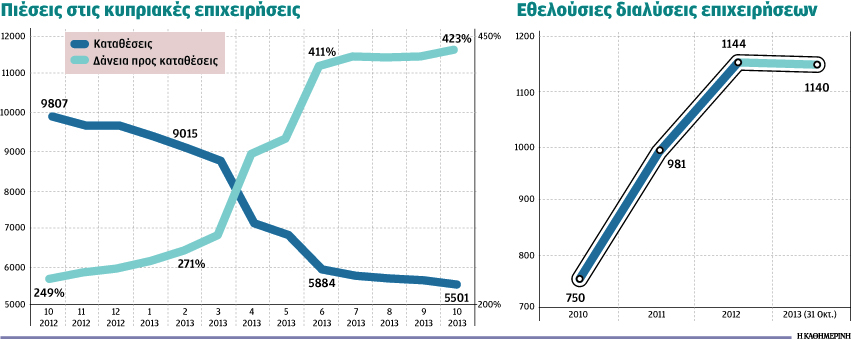 Η μείωση αυτή των καταθέσεων είναι εντυπωσιακή: Υποχώρησαν κατά 43% τους τελευταίους 12 μήνες, ενώ η μείωση των καταθέσεων των κυπριακών επιχειρήσεων από τον Μάρτιο ως τον Οκτώβριο ήταν 36% (συμπεριλαμβάνεται και του κούρεμα). Μετά το κούρεμα, οι επιχειρήσεις «τράβηξαν» 1,5 δισ. ευρώ μέσα σε ένα τρίμηνο.