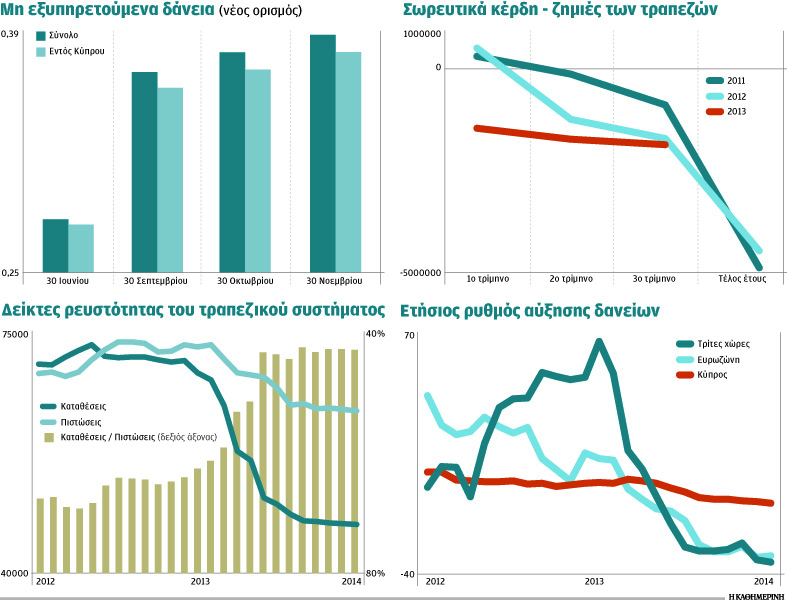 Σε κάθε περίπτωση, όμως, η τραγική εικόνα στην ποιότητα των πιστώσεων δεν μπορεί παρά να προκαλεί ισχυρές ανησυχίες, έστω κι αν η αλλαγή στον ορισμό που χρησιμοποιεί η Κεντρική Τράπεζα επηρεάζει αρνητικά τα τελικά στοιχεία. Στην πραγματικότητα, τα μεγάλα μη εξυπηρετούμενα δάνεια εστιάζονται σε Τράπεζα Κύπρου και Ελληνική, όπου το συνολικό τους επίπεδο κινείται σχεδόν στο αστρονομικό 50%. Άλλες, μικρότερες τράπεζες είναι σε χειρότερη κατάσταση, ενώ και στα Συνεργατικά η εικόνα είναι εξίσου τραγική σε ορισμένες περιπτώσεις. Επιπλέον, το γεγονός ότι ο όγκος των μη εξυπηρετούμενων δανείων εστιάζεται στις κατασκευές (64%) και στον τουρισμό (55%) δείχνει πως το ρίσκο αγοράς είναι εξαιρετικά υψηλό. Με τη σειρά του, αυτό σημαίνει πως δύσκολα θα μπορεί να ανατραπεί η εικόνα με «παραδοσιακές» κινήσεις.