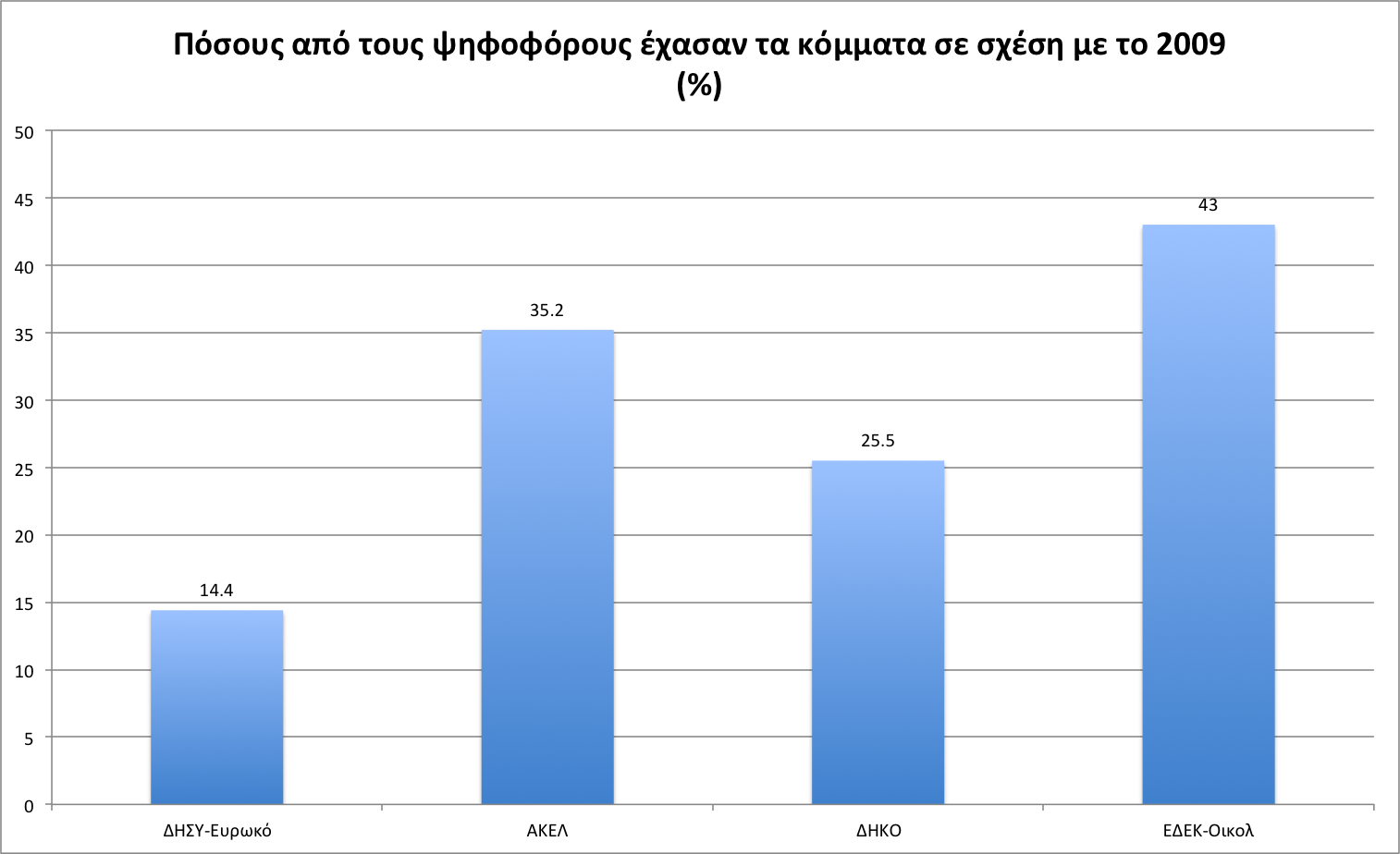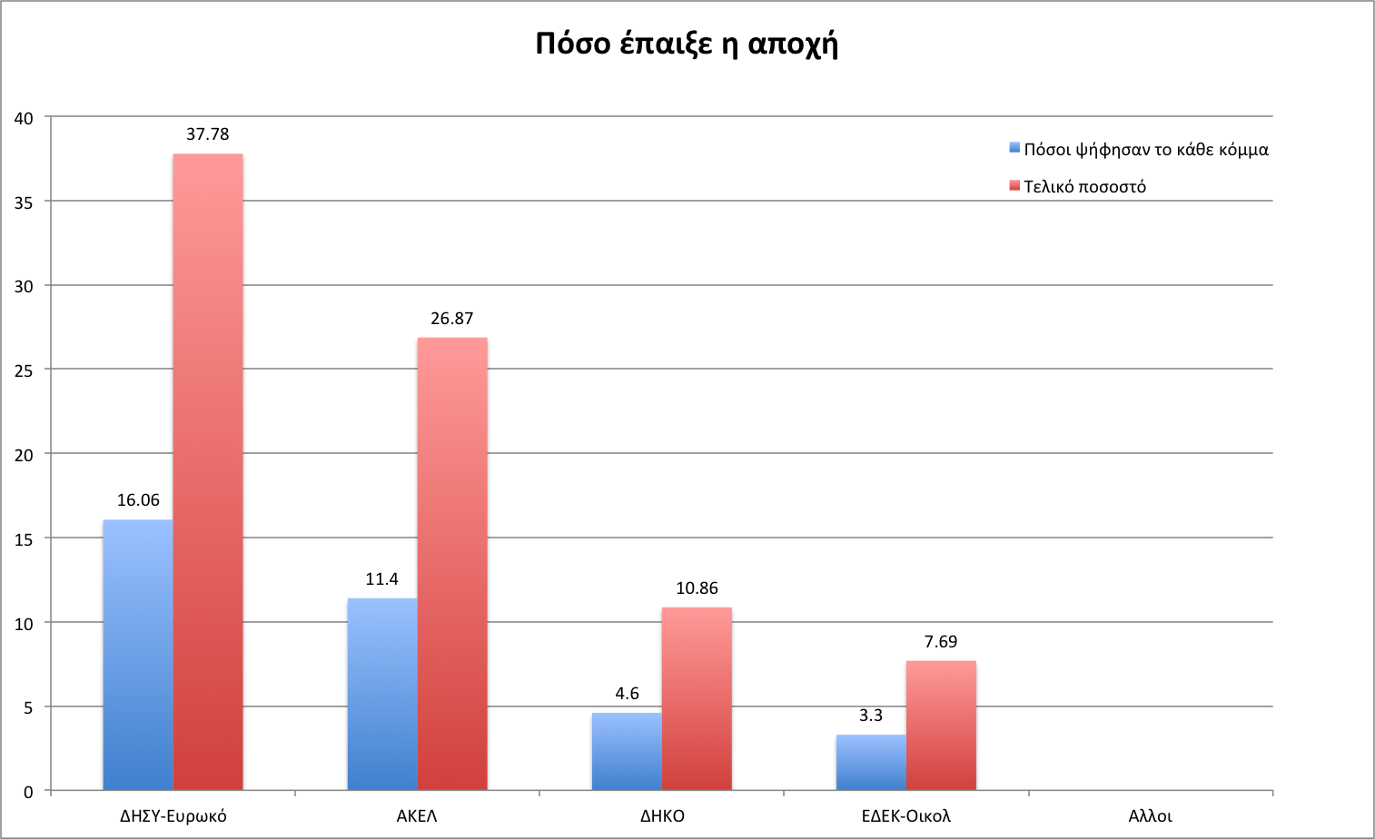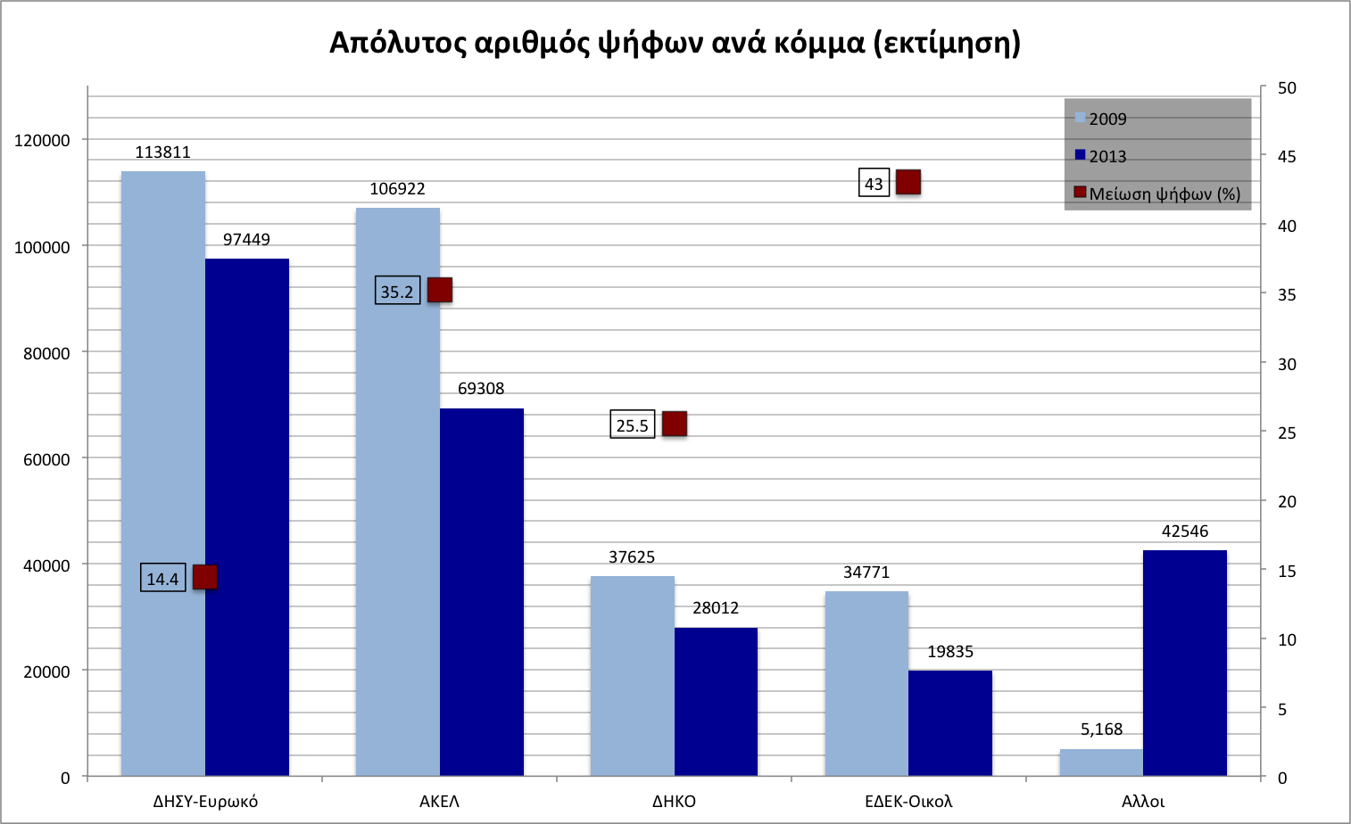 Αυτό που προκύπτει είναι πως, ενώ το ΑΚΕΛ και η ΕΔΕΚ κατέγραψαν σοβαρότατες απώλειες σε σχέση με το 2009, έχοντας χάσει μεταξύ τους περίπου 60.000 ψήφους (10% του εκλογικού σώματος), εντούτοις ακόμα κι αυτοί έδειξαν μεγαλύτερες αντοχές από ό,τι πολλοί ανέμεναν, αφού η αποχή δεν περιορίστηκε στους εν λόγω συνδυασμούς, αλλά προήρθε και από τα άλλα κόμματα.