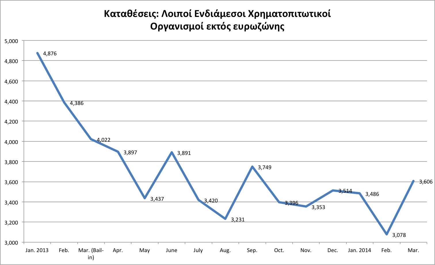 Τον Μάρτιο καταγράφηκε κάποια αύξηση στο σύνολο των καταθέσεων, η οποία ωστόσο οφείλεται σε εισροή καταθέσεων από «Λοιπούς Χρηματοπιστωτικούς Οργανισμούς» εκτός της Ευρωζώνης. Η συγκεκριμένη κατηγορία καταθέσεων καταγράφει διαχρονικά σημαντικές διακυμάνσεις. Παρόλο που οι εισροές σε δολάρια παραμένουν μάλλον σταθερές, δεν μπορεί να θεωρηθεί πως η εισροή αποτελεί ένδειξη για αλλαγή του κλίματος ανάμεσα στους καταθέτες. Ουσιαστικά, η καθαρή εισροή, ύψους 529 εκατ. ευρώ, ακολούθησε μία συνεχή καθαρή εκροή από τον Σεπτέμβριο ώς τον Μάρτιο, που έφτασε τα 672 εκατ. ευρώ. Τον Απρίλιο, και μετά την εισροή του σχεδόν μισού δισ. ευρώ, οι συνολικές καταθέσεις των λοιπών ΧΠΙ, παρέμειναν χαμηλότερες από ό,τι τον Σεπτέμβριο.