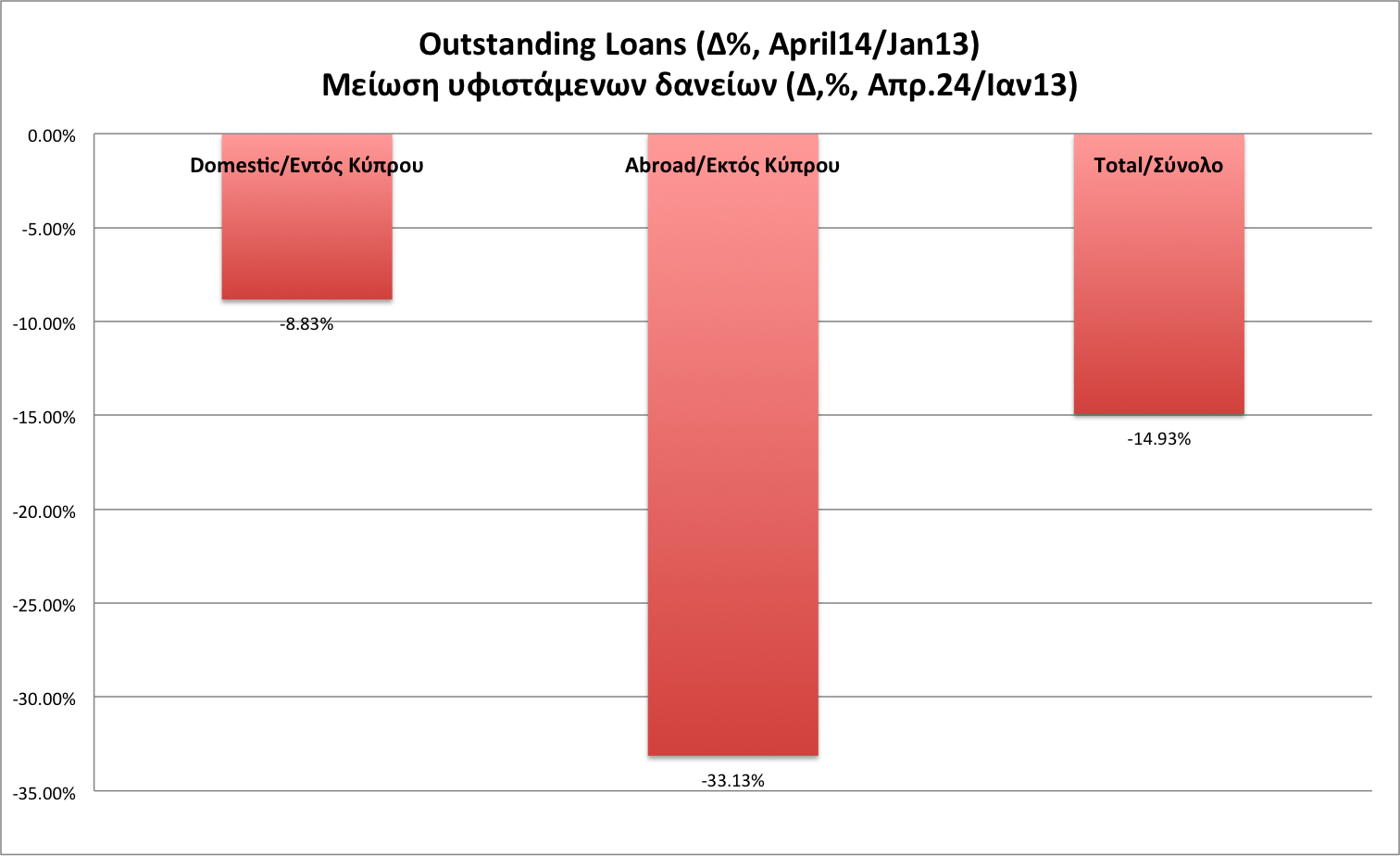Η μείωση των υφιστάμενων δανείων στο εξωτερικό, σε μεγάλο βαθμό αντικατοπτρίζει την αποξένωση των εν Ελλάδι εργασιών της Τράπεζας Κύπρου και της τέως Λαϊκής. Ωστόσο, το γεγονός ότι αυτή η τάση συνεχίζεται ακόμα, δείχνει κι άλλες επιπλέον κινήσεις απομόχλευσης. Εκτός από τη μείωση ή και ανάκληση δανείων στο εξωτερικό, έχουν καταγραφεί επιπλέον κινήσεις όπως η πώληση ενεργητικών στην Αγγλία ή η αποξένωση των εργασιών στην Ουκρανία για την Τράπεζα Κύπρου. Μέσα στους 12μήνες που έληξαν τον Απρίλιο, το κυπριακό τραπεζικό σύστημα μείωσε συνολικά τις πιστώσεις που έχει παραχωρήσει εκτός Κύπρου κατά 1/3.