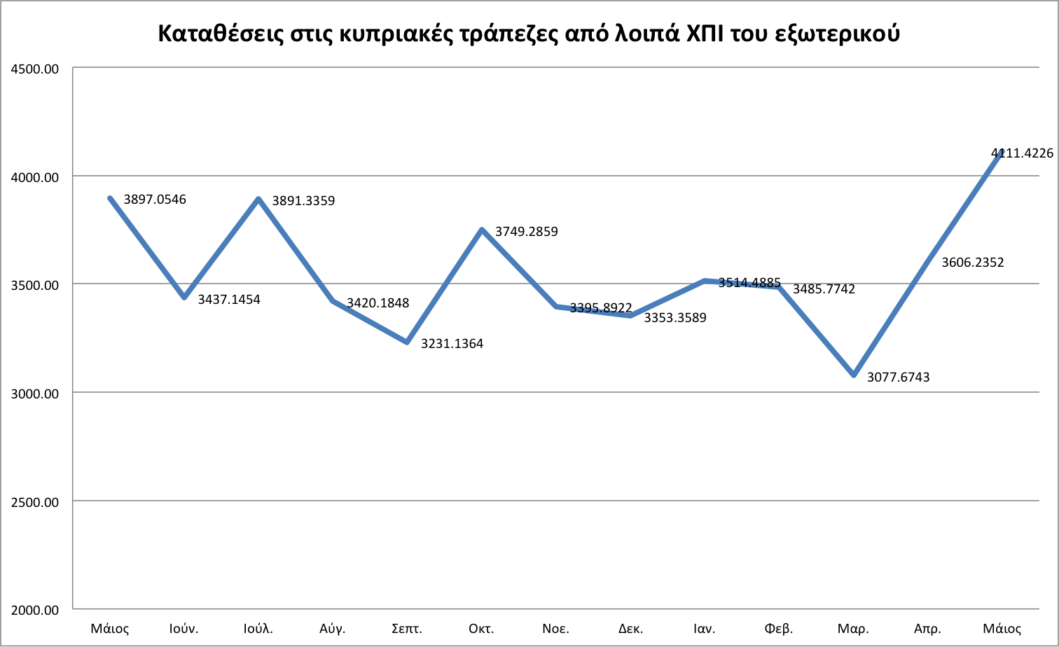 Από τον Μάρτιο και μετά, καταγράφονται συνεχείς, μάλιστα αυξήσεις στις εισροές από ξένα ΧΠΙ, με επίκεντρο εκείνα που βρίσκονται εκτός Ευρωζώνης. Πρέπει η αισιοδοξία που δικαιολογημένα προκαλεί η εισροή να είναι κάπως μετριασμένη προς το παρόν, με σαφή τάση να διαφαίνεται αργότερα αυτό τον μήνα, όταν θα δημοσιευτούν τα αποτελέσματα Ιουνίου. Με δεδομένο το γεγονός ότι οι καταθέσεις από ξένους χρηματοπιστωτικούς οργανισμούς έχουν την τάση να καταγράφουν πολύ μεγάλες διακυμάνσεις, δεν πρέπει να αποκλείεται κάποια εκροή στο επόμενο διάστημα. Μία τέτοια εκροή, μάλιστα, θα μπορεί να κριθεί και ως «φυσιολογική», μετά τις συνεχείς εισροές από τους συγκεκριμένους καταθέτες.