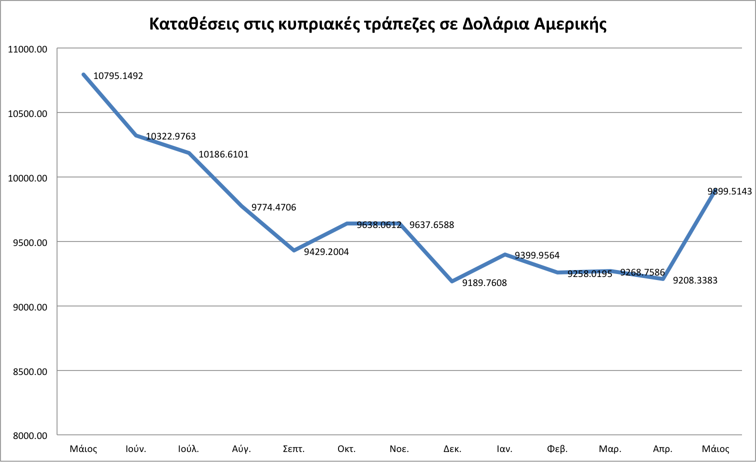 Παρόλο που τον τελευταίο χρόνο οι καταθέσεις σε δολάρια δείχνουν μία σταθερά πτωτική τάση, εντούτοις συνεχίζουν να έχουν μεγάλες διακυμάνσεις. Μήνες με καθαρές εισροές της τάξης των 200 εκατ. ευρώ (σε δολάρια πάντα) δεν είναι σπάνιες, ενώ πριν από τον Μάιο του 2013, οι διακυμάνσεις ήταν ακόμη πιο μεγάλες: Εισροές και εκροές της τάξης του 1 δισ. ευρώ δεν ήταν καθόλου σπάνιες, καθώς γίνονταν μεγάλες προσωρινές καταθέσεις από ιδρύματα που χρησιμοποιούσαν τις κυπριακές τράπεζες ως «διαμετακομιστικό σταθμό».