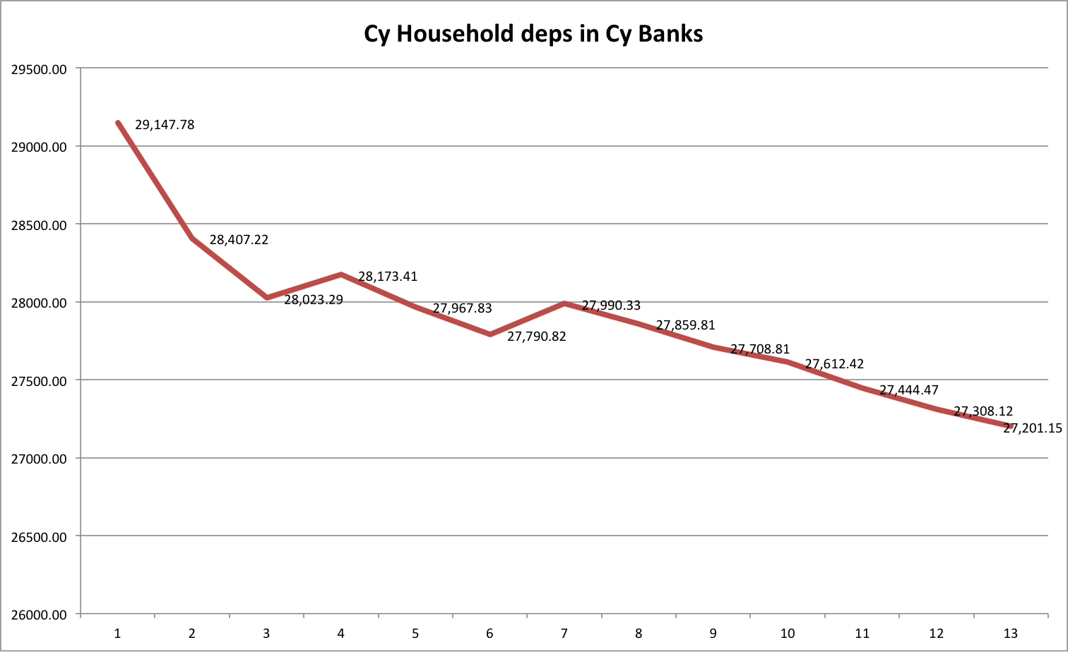 Όσον αφορά στις καταθέσεις που προέρχονται από άλλες χώρες της Ευρωζώνης, παρατηρείται μια σταθεροποίηση. Πλέον, και μετά τη μαζική έξοδο των τραπεζών της Ευρωζώνης κατά τη διάρκεια της περιόδου κατά την οποία αυξανόταν αστρονομικά ο ELA στη Λαϊκή, τα νοικοκυριά αποτελούν τη σημαντικότερη κατηγορία καταθετών από το ευρωσύστημα. Αυτές οι καταθέσεις διατηρούν την τάση που άρχισε να διαφαίνεται πριν από μερικούς μήνες, με σταθερή αλλά ρηχή έξοδο των καταθέσεών τους. Η μείωση του περασμένου μήνα ήταν απόλυτα συμβατή με την τάση που άρχισε πριν από ένα ακριβώς χρόνο. Θα πρέπει να αναμένεται ότι θα σημειωθεί κάποια σταθεροποίηση σε αυτές τις καταθέσεις σύντομα, καθώς θα βρίσκουν τον πάτο του. Πάντως, η σταδιακή μείωση των καταθέσεων από ξένα νοικοκυριά έφτασε τους τελευταίους 12 μήνες στα 551 εκατ. ευρώ, ένα σημαντικό ποσό, το οποίο ωστόσο δείχνει σταθερή τάση.