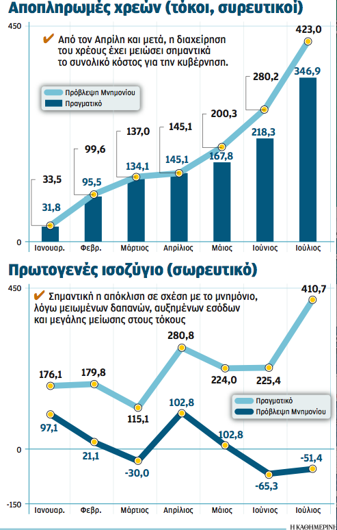 Το συγύρισμα, ωστόσο, με την αύξηση των εσόδων και τη μείωση των δαπανών σε σχέση με τις αρχικές εκτιμήσεις αλλά και τους στόχους του μνημονίου, είναι πως πέραν από το πρωτογενές πλεόνασμα που αυτές δημιουργούν, συντείνουν σημαντικά στη βιωσιμότητα του χρέους αλλά και στη σημαντική συγκράτηση των συνολικών ελλειμμάτων.