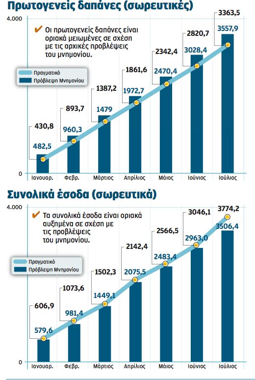 Ως προς τις δαπάνες του κράτους, η εικόνα είναι πολύ πιο ομαλή. Σε όλη τη διάρκεια του έτους, οι πρωτογενείς δαπάνες (χωρίς να υπολογίζονται οι δαπάνες για εξυπηρέτηση του χρέους) παρέμειναν σταθερά χαμηλότερες των εκτιμήσεων κατά περίπου 5%. Έτσι, υπάρχει περισσότερη «εμπιστοσύνη» πως η εικόνα των πρώτων επτά μηνών αποτελεί ισχυρή ένδειξη πως η τάση θα παραμείνει η ίδια μέχρι και το τέλος του έτους. Η απόκλιση, πάντως, μεταξύ των αρχικών εκτιμήσεων και των τελικών αποτελεσμάτων είναι σχεδόν 200 εκατ. ευρώ, μια διαφορά που αντιστοιχεί στο 1,18% του ΑΕΠ.