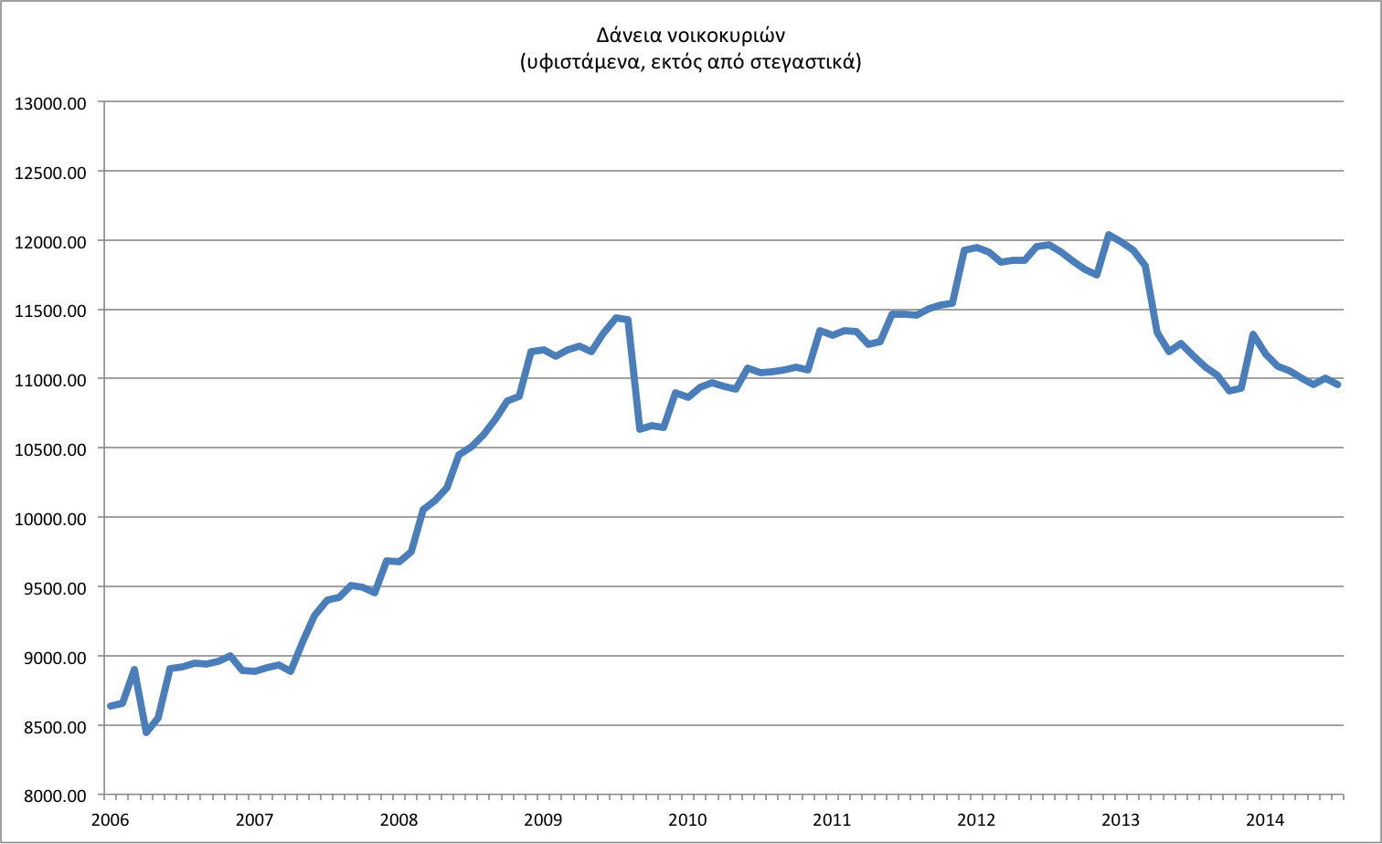 Τα τελευταία πέντε χρόνια πριν από την εκδήλωση της κρίσης, τα στοιχεία της Κεντρικής Τράπεζας καταγράφουν μια δραματική αύξηση των πιστώσεων προς τα νοικοκυριά, ακόμα κι αν εξαιρέσει κανείς τα δάνεια που αφορούν σε σκοπούς στέγασης. Η ραγδαία αύξηση των πιστώσεων, μάλιστα, προκύπτει όχι μόνο από την αύξηση στα δάνεια που κατατάσσονται στην κατηγορία «καταναλωτικά» αλλά και στα λεγόμενα «άλλα» δάνεια. Ο συνδυασμός των δύο δείχνει πως υπήρχε συνεχιζόμενη αύξηση των πιστώσεων για καταναλωτικούς σκοπούς από το 2006 μέχρι και το 2009. Μέσα σε τρία χρόνια, τα υφιστάμενα δάνεια των νοικοκυριών (εξαιρουμένων των στεγαστικών δανείων) έφτασε στο αστρονομικό 30%. Είναι καταφανές πως η αύξηση αυτή δεν ήταν δυνατόν να κριθεί ως βιώσιμη.