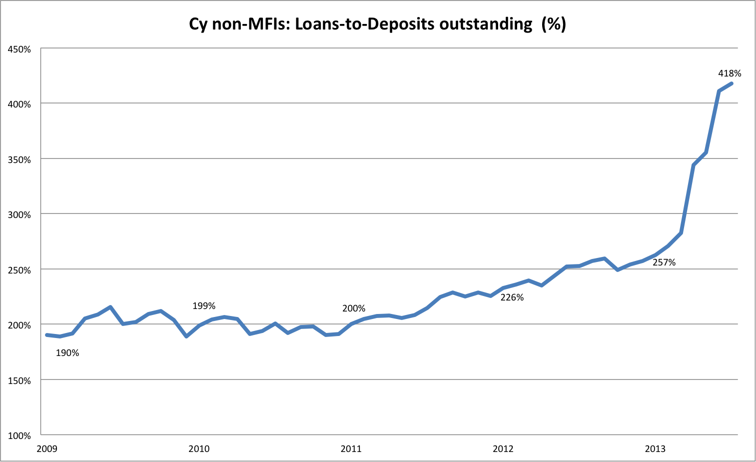 Coming back, for now: Deposits from outside of Cyprus (mainly non-Eurozone) are recovering rather dramatically in the last set of Central Bank data. Indeed, outstanding amounts are at their highest point for the last year. We are noting, however, that foreign deposits fluctuate a lot -reflecting short term deposits, driven by USD siphoned through Cyprus for payments in the wider region of the Eastern Mediterranean. This trend tends to become more acute as stability in the region declines.