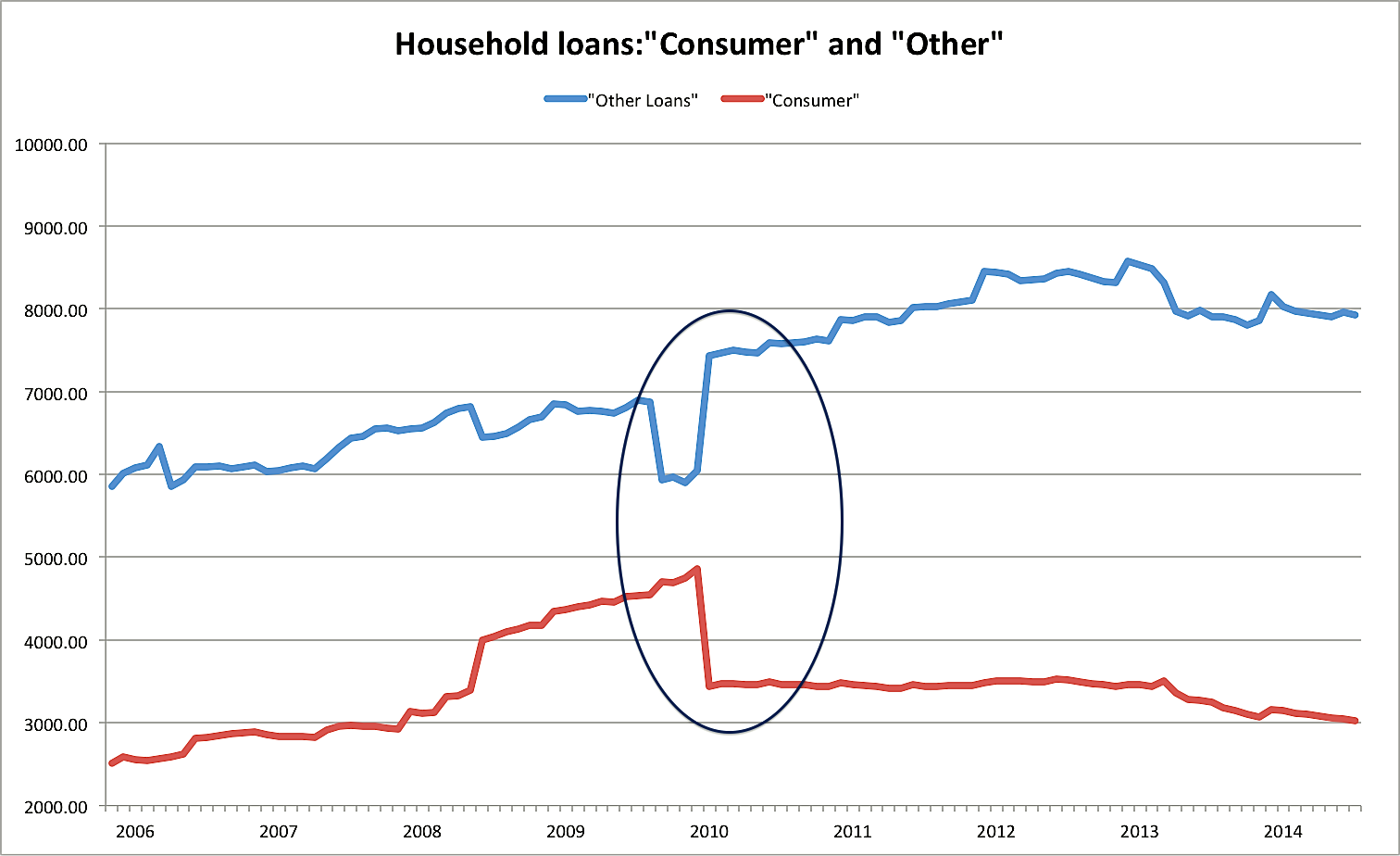We raised the question on (overall) consumer loans in the previous chart; although the Central Bank is quite protective of its definitions (!) and changes to them, this is a pretty clear sign that the change was on the definition, not the real underlying trends.