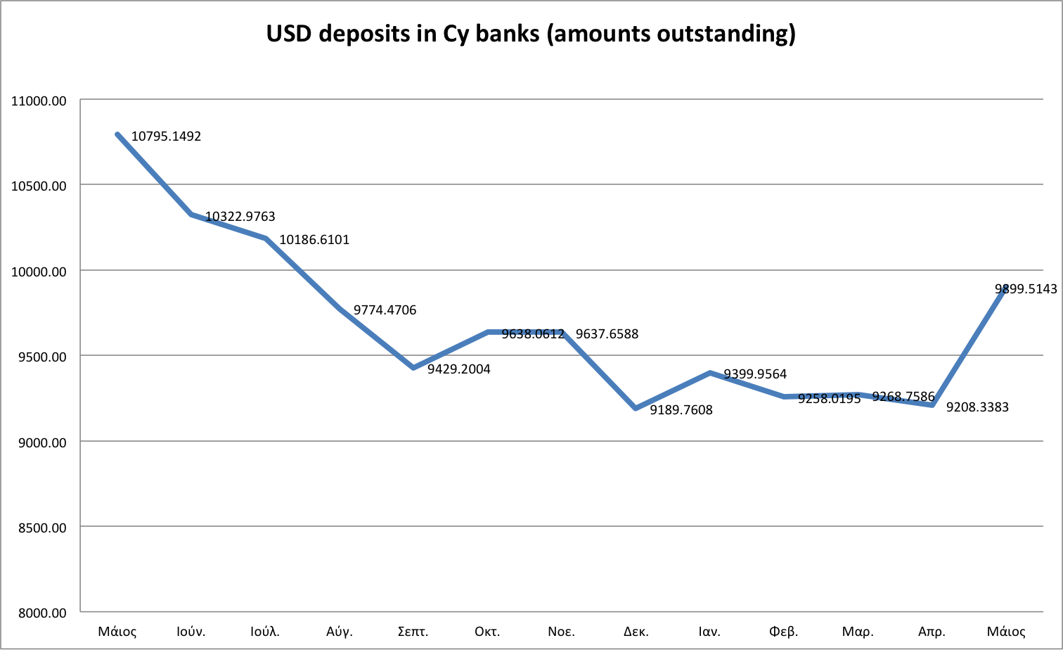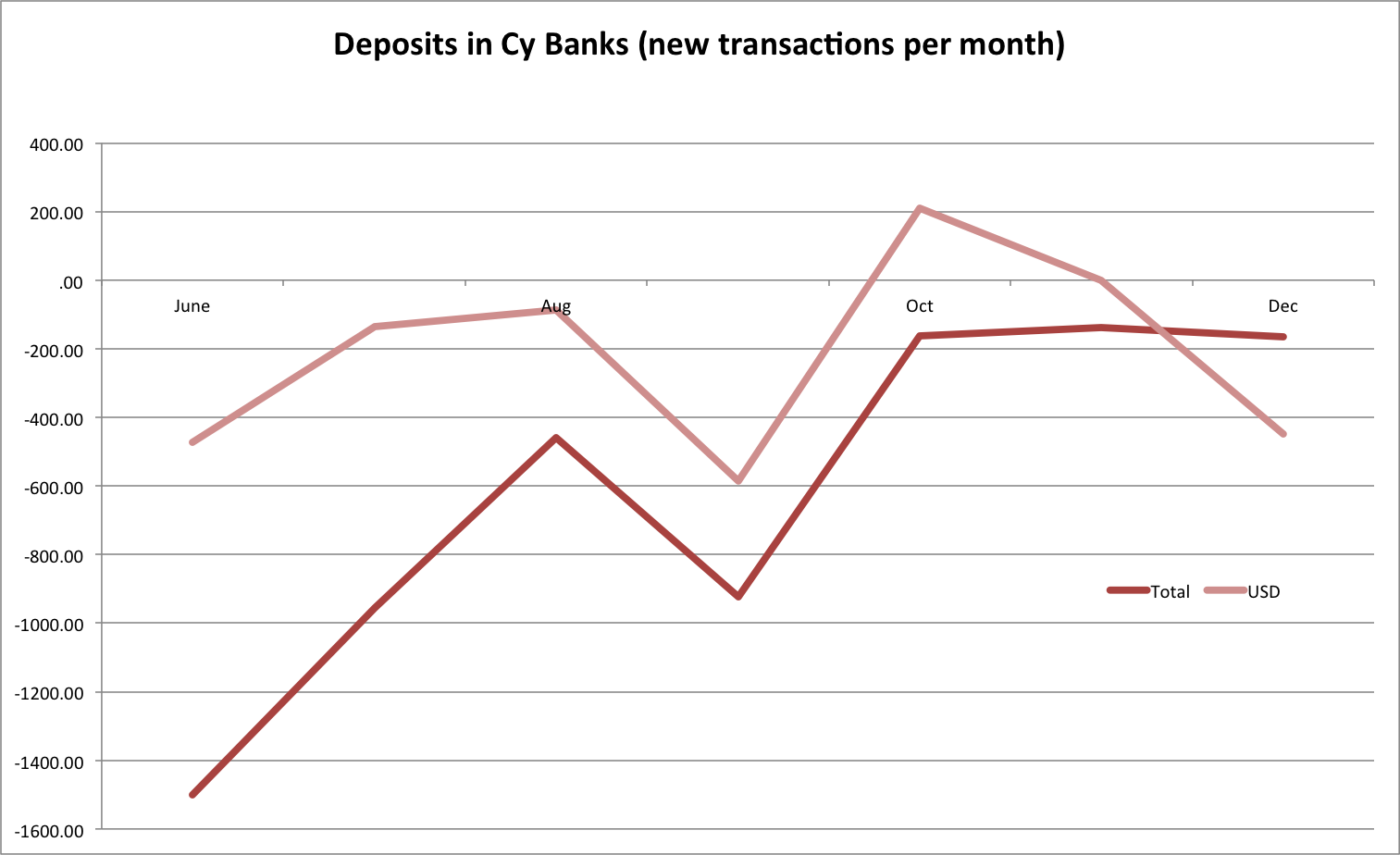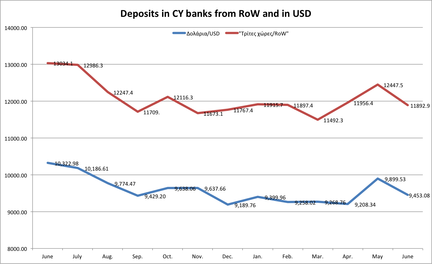 We had commented earlier (8 July below) that the fast and happy USD inflows would probably reverse soon enough and indeed they did. At the time, many a banker were celebrating that overall deposits were beginning to increase; we noted that the overall increase was due to USD inflows and that these were short-term deposits. Now it’s time for the opposite comment: No cause for panic as overall Cy bank deposits are recording a decline; the decline is due to USD exit, which is natural, expected, and strongly (if erratically) cyclical.