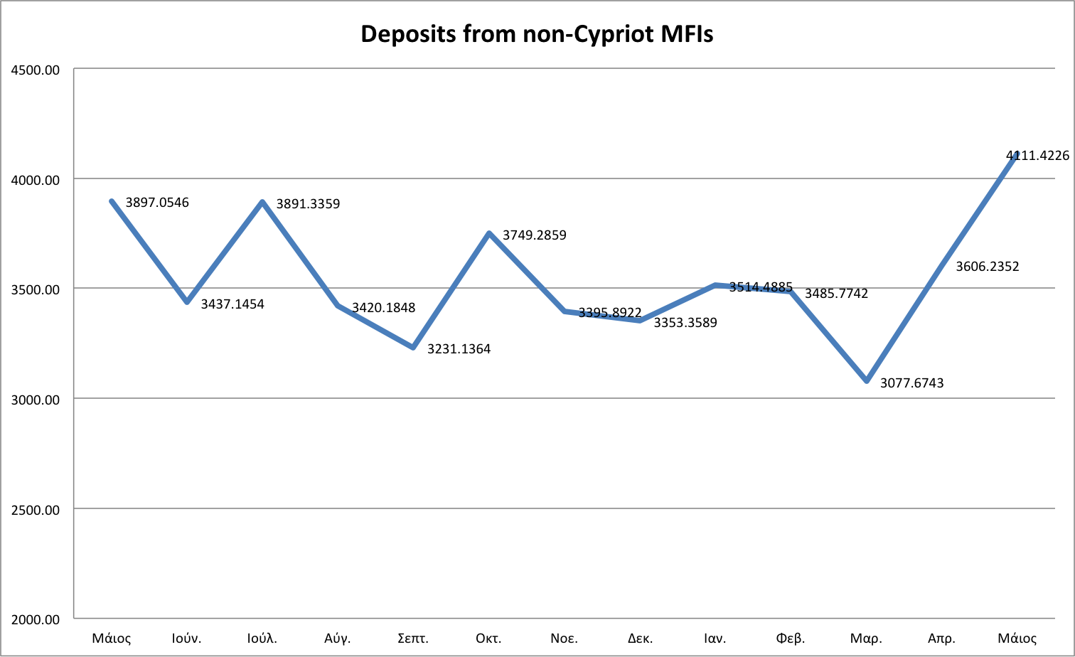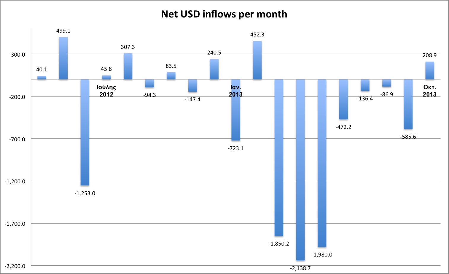 This time, and although USD inflows are rather flat, the large oscillations in the category of «there MFIs» from outside the eurozone indicate that the category is usually comprised of short-term deposits (mainly working capital). We therefore can’t talk about «a deposits inflow» as this appears to be a temporary inflow into the system.