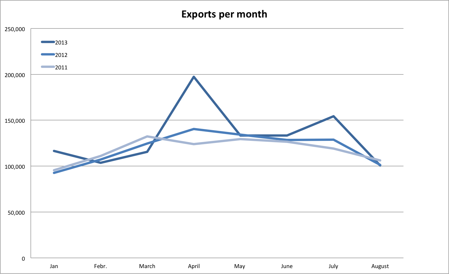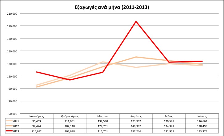 Exports are finding it more difficult than is generally assumed to pick up the slack in the economy. Although overall exports are up y-o-y, the «April spike» distorts the picture. This was a single transaction: A sale of two aircraft worth 67million, weighing 84.2 tons (total), to a buyer in the UK. No other information is available except that the seller has no flying license in Cyprus -probably it’s a brass plate selling off assets that get recorded in Cyprus.