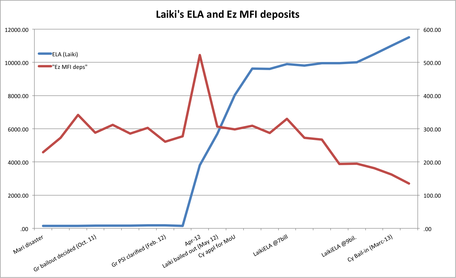 Between August 2012 and the bail-in in March 2013, we insisted that Laiki’s ELA was a bad idea because the bank was insolvent and because, in any case, the bank could never repay the obligations. One of the questions raised (here) was wether the delay in dealing with the bank -and the subsequent astronomical growth of ELA- was related to an effort to buy time for Eurozone MFIs with deposits in Laiki, to pull out. Although intent can’t be proven, this was one of the effects; the Central Bnk governor admitted as much, calling them «best informed investors» (link above). The bottom line, however, was that the Central Bank had decided, in the words of tis Governor, to «keep the bank on a respirator until elections took place». The results are now clear.