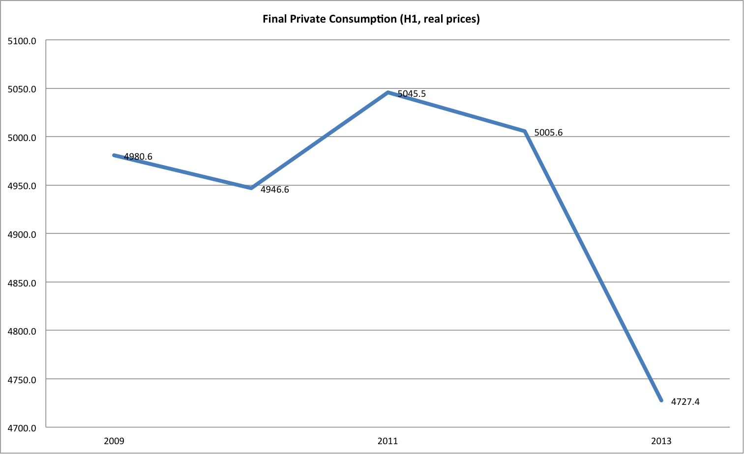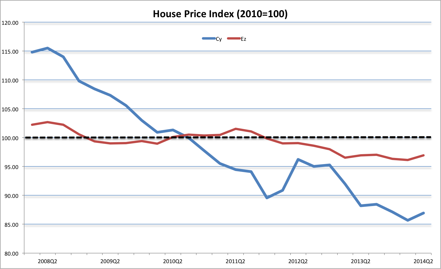 House Prices have been declining since 2008, when the bubble started to burst. The decline has been protracted and, compared to 2008, deep. However, we feel that the methodology used understates the decline: Land Registry Department reviews prices based on «recorded sales»; when a large, luxury, beach hotel was sold, the sale price fed into the entire area’s real estate prices, including homes. The only alternative, used by the Central Bank, is based on a survey of Real Estate Agents, who have strong  incentives to overstate prices. With a small and slow secondary market in the country, actual administrative data is slow and not dependable. The correction may well be much deeper than the data says.