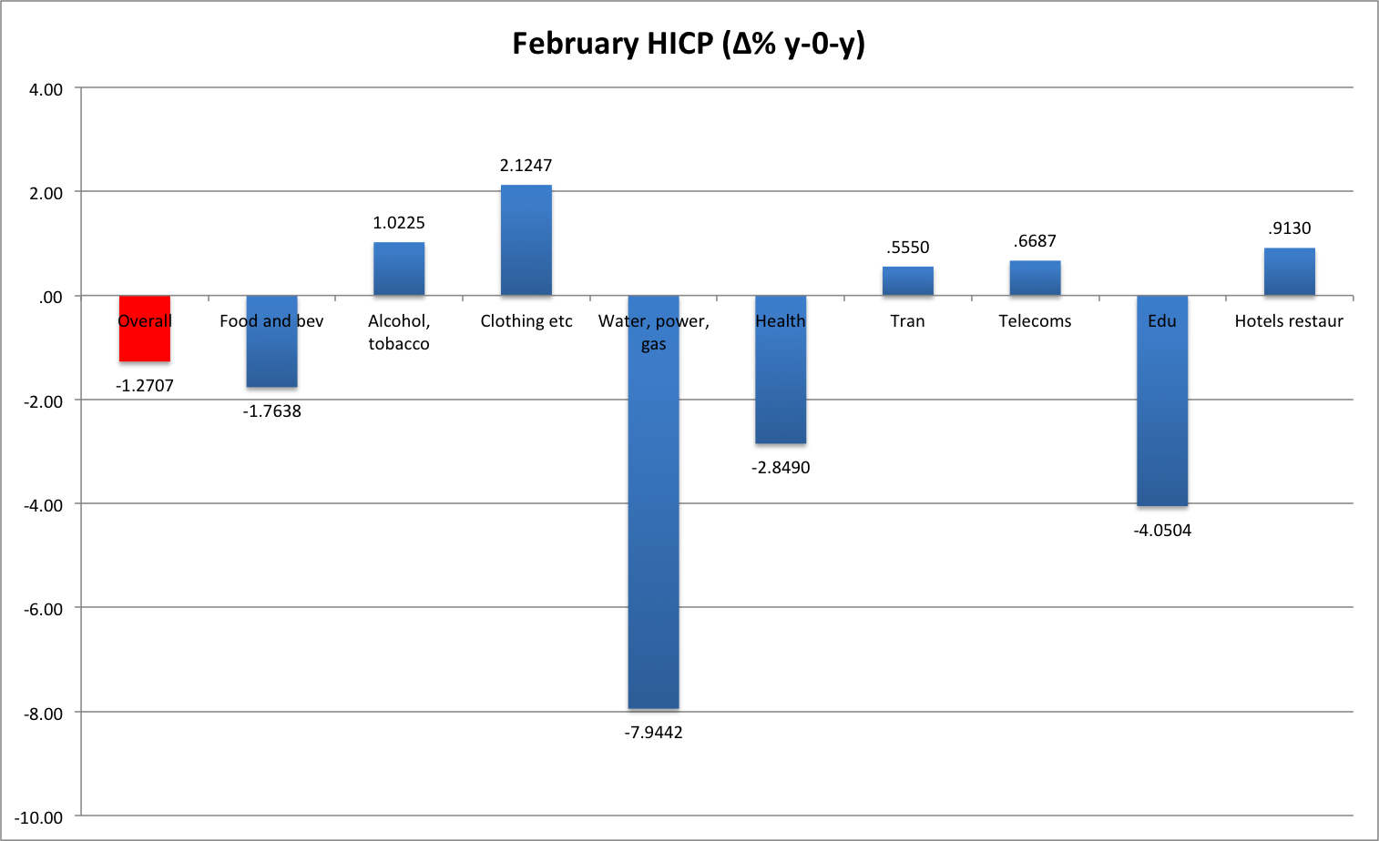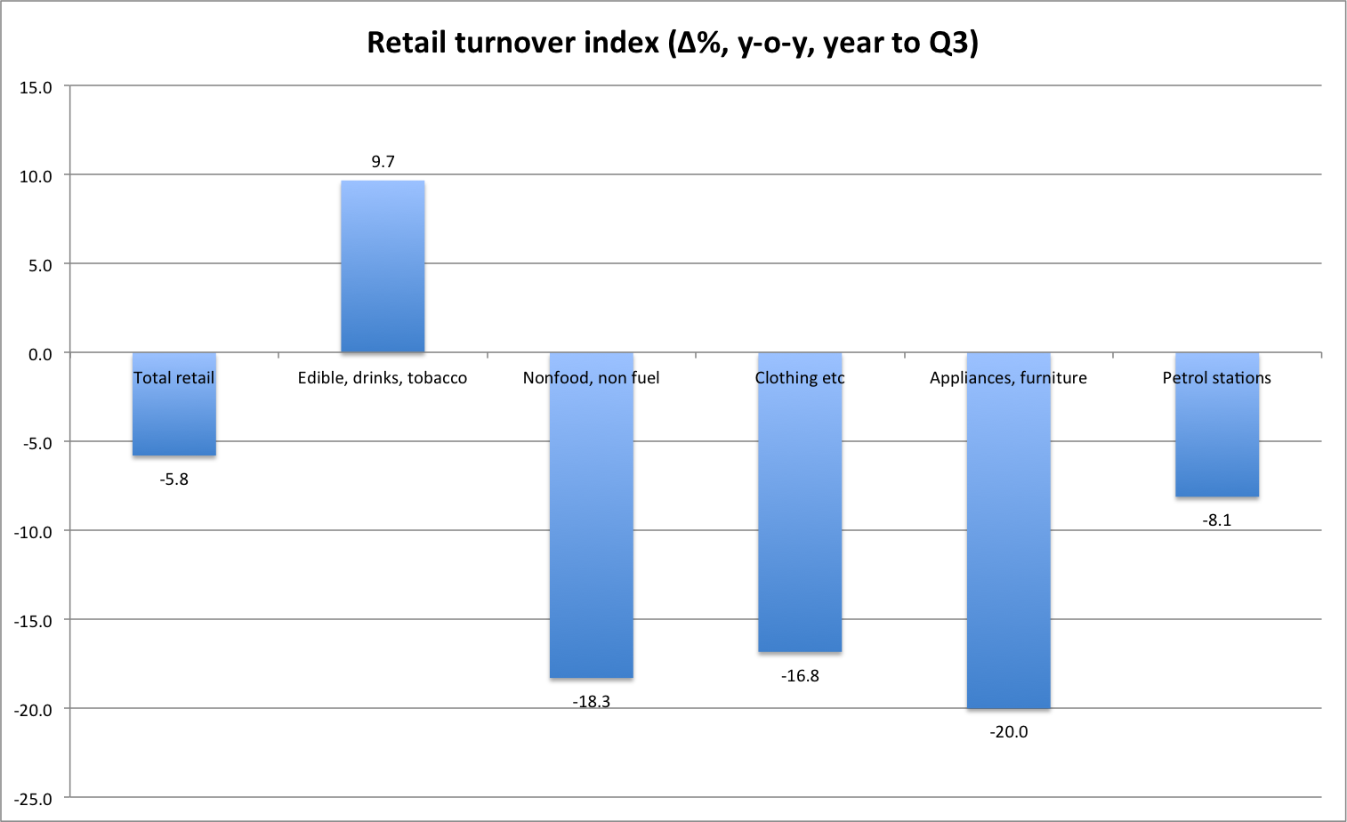Tobacco and Alcohol is also holding overall CPI in positive area as it records continued inflationary pressures. In August (not in chart), it reached 10%. This is partly driven by increased demand (approx. 8% increase in turnover) which is normal for inferior goods, as well as by tax hikes.