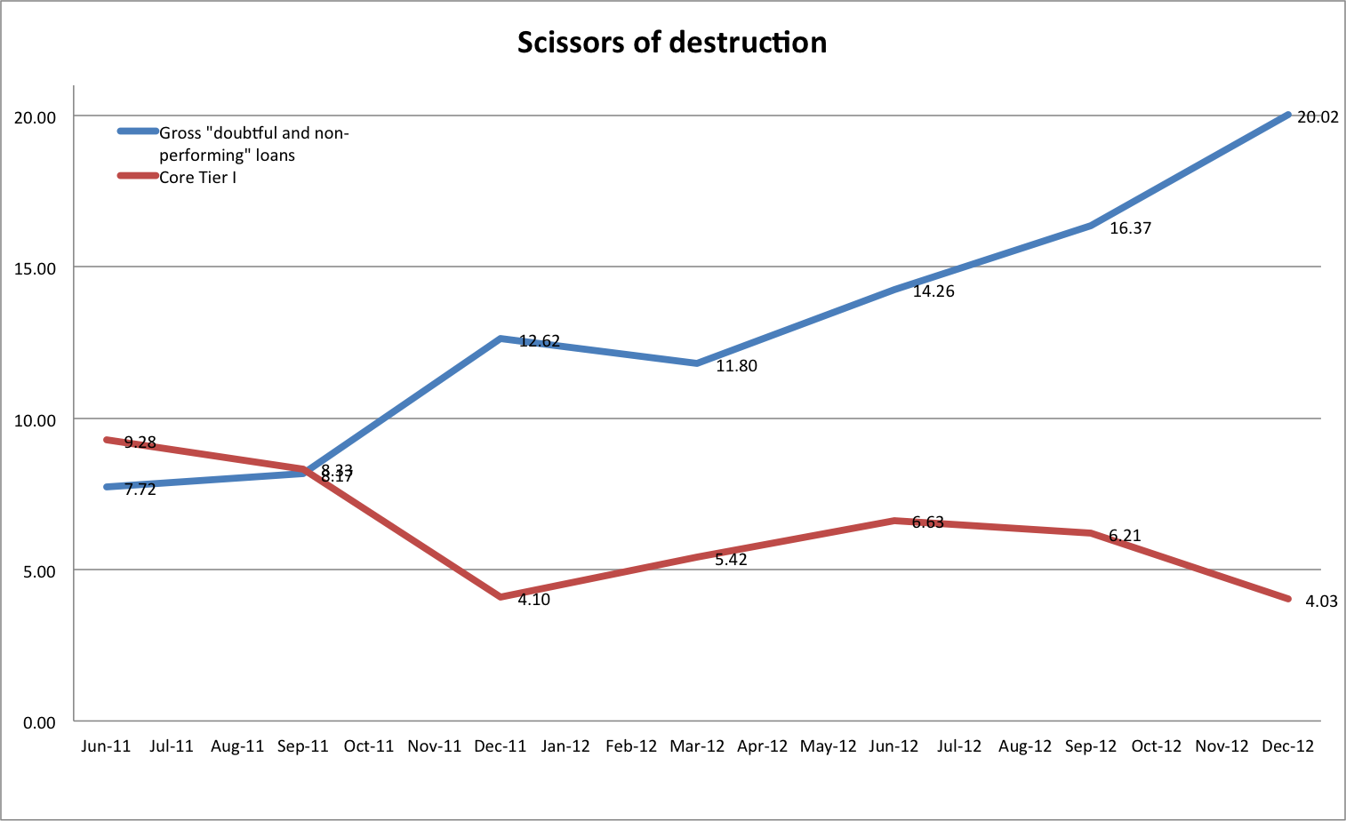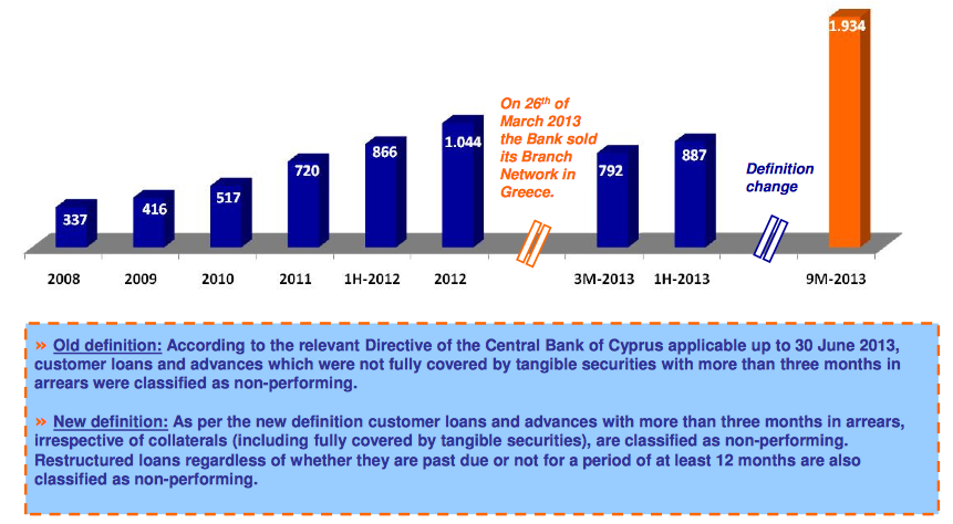 Another point on loan restructuring. Long before its resolution (merger of what was left with BoC), Laiki shows something strange: A spike (10%, or 800m) on outstanding «credits» in May 2012, right after the bank was bailed out (long before the bail-in).
