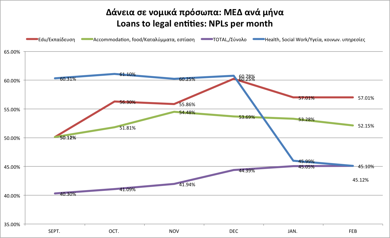 Doing better? Despite the tight NPL definition used by the Central Bank, which categorises as NPL all restructured loans and does not allow de-categorisation until 6 mos after the highest instalment, some NPL categories  have been showing improvement at the beginning of the year. We are noting Education/Traininng with some interest, and Health with even more interest. Note also that hotels are noting a decline in NPLs.