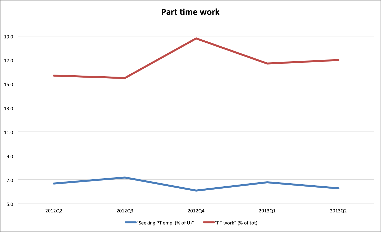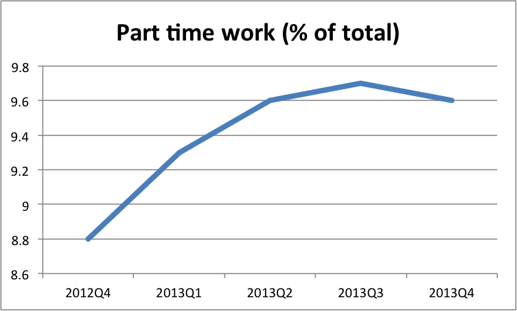 Labor market adjusting, but slowly. Not a very impressive change, but nonetheless two things appear to be happening. First, part time work is increasing as percentage of total employment, especially when compared on a y-o-y basis (Q2 over Q2, which is the latest). Data is not seasonally adjusted. Second, more of the unemployed are looking for full time work, but can’t find any.