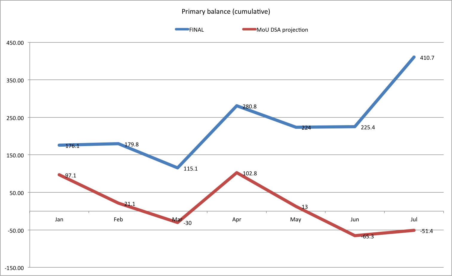 Primary spending has been performing better than MoU/Program targets throughout the program period (so far). Together with increased revenues, this has helped hold primary balances within program targets/predictions, creating an important fiscal buffer from DSA assumptions. This buffer could be used to cover Co-op recap needs after stress tests and amounts to approximately 1 bil. euro.