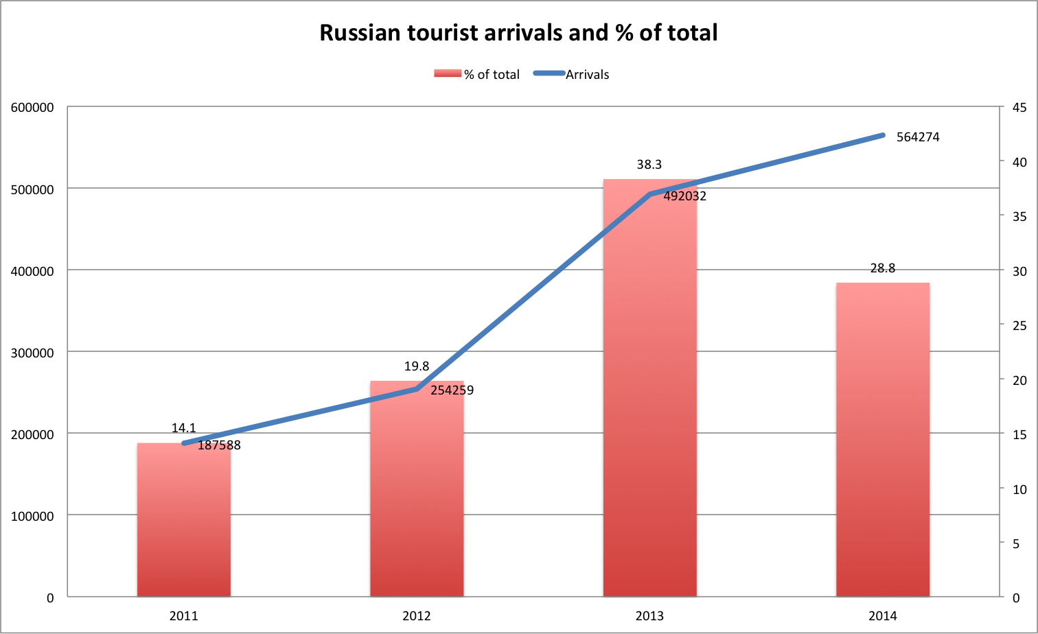 On the upside, per capita spending has been improving, showing that some of the recent upper-end hotels that are coming online are paying offl as long as these tourists (mainly Russian) are not too badly hurt by the Crimean crisis, the per-capita-spending figures might not reverse themselves, especially is distressed asset sales translate to better management and better deals with agents.