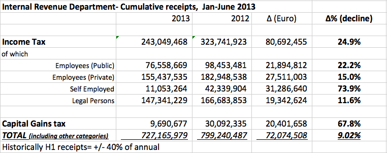 Internal Revenue Department receipts (Cyprus) have been looking a little troubled. Note the blazing drop of revenues from direct taxes to the Self Employed. The decline can’t be attributed to delayed payments, shifting deadlines etc- it’s mainly from failing SMEs. Capital Gains tax is also worrying. These -plus consumption data- worsen expectations about GDP growth come September -and make VAT results (up by a hair’s breadth, y-o-y in July) even more puzzling.