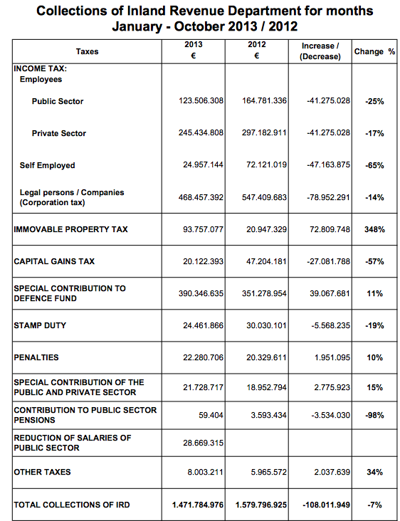 Tourist arrivals didn’t fare too badly, even if compared to the «mediocre» results of 2012. Interestingly, the numbers recorded by Cystat on the main countries of origin show that we should be expecting some dislocation in the markets -more people coming in from non traditional markets. Russia continues to do well, with continued growth, largely driven by the fact that there is now a critical mass of Russians in Cyprus to allow specialized services (Russian stores, Russian-speaking clubs and services, charter flights etc).