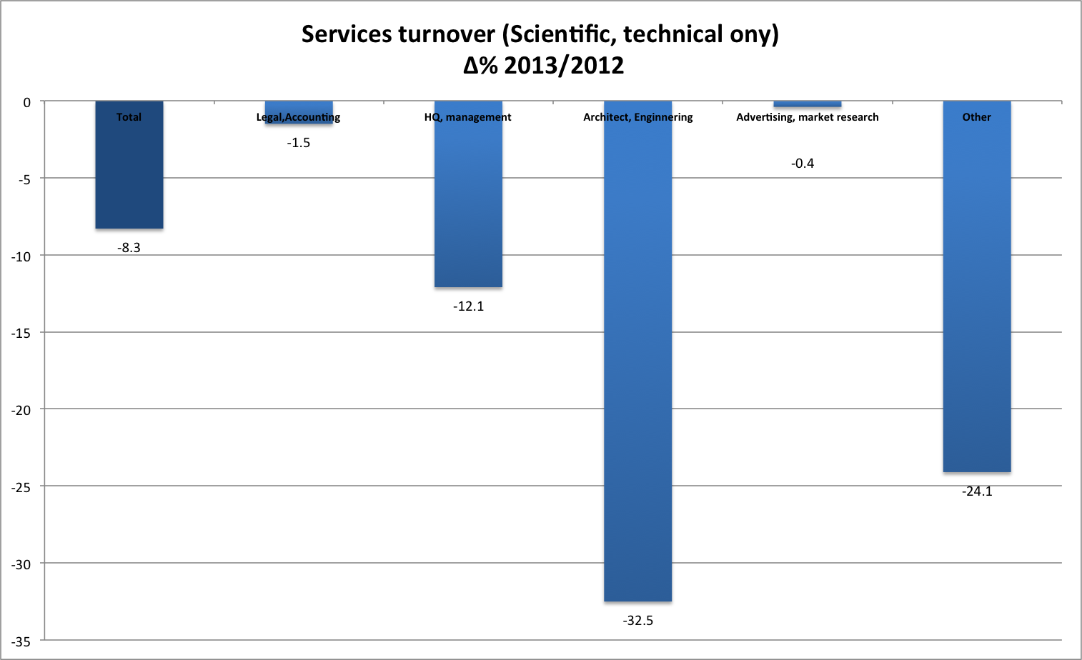 Services, until Q1 the most robust category in GDP, is beginning to record declines in turnover. Interestingly, market research and advertising is up by 1.3% despite overall declines in retail. This might be reflecting the positioning war among retailers, especially «specialized stores» selling food, tobacco and beverages (i.e. supermarkets). Architecture, engineering etc obviously reflect construction declines.