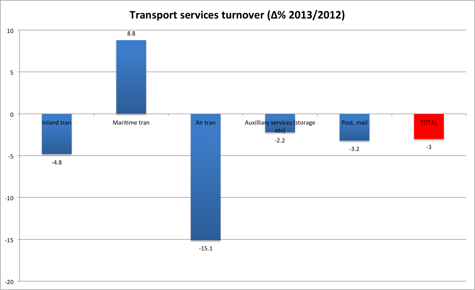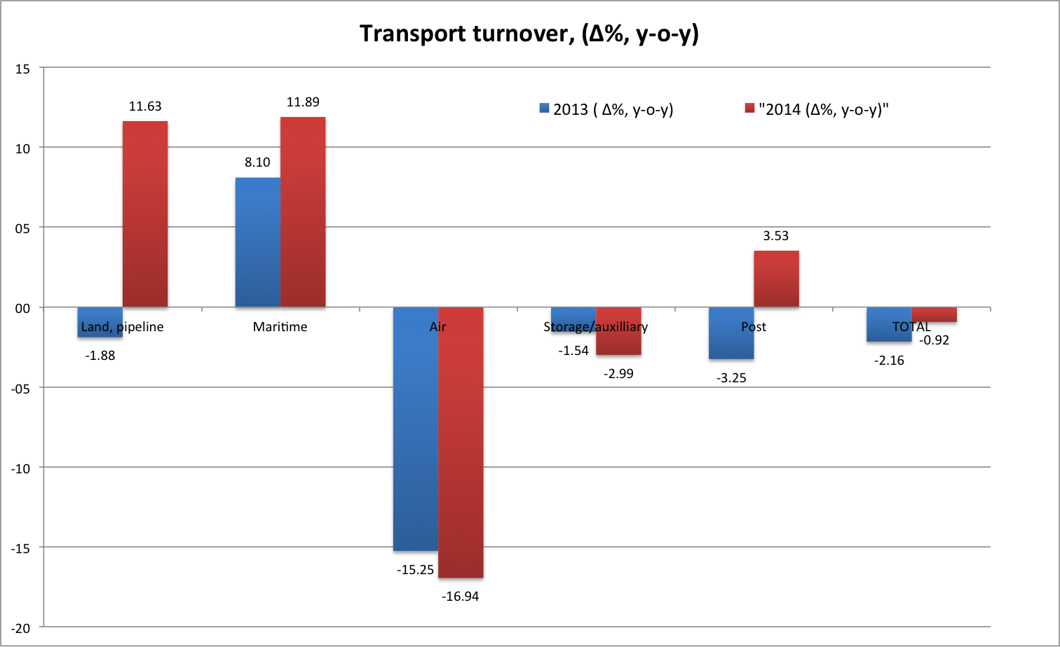 Interestingly, road transport is rebounding strongly after a flat 2013, sign that the recession is bottoming out.