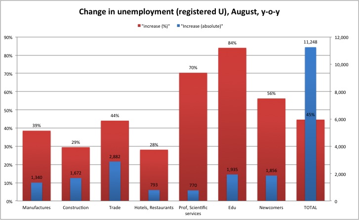 Unemployment still increasing, reaching 17.3%. August was particularly bad. Most worrying is the increase in U among hotels, restaurants etc. Although August figures are still not out, and July arrivals were down, we can assume that turnover will be lower for this summer. Other figures are pretty bad, but as expected. We expect newcomers to increase in Sept. as people graduate and start looking for jobs, although this number is grossly understated because newcomers have no benefits and hence don’t register.